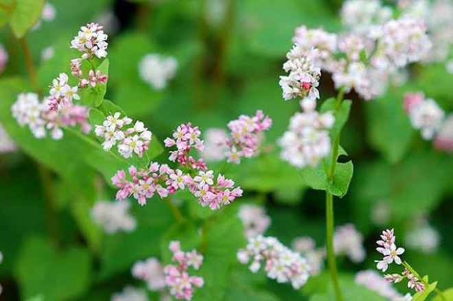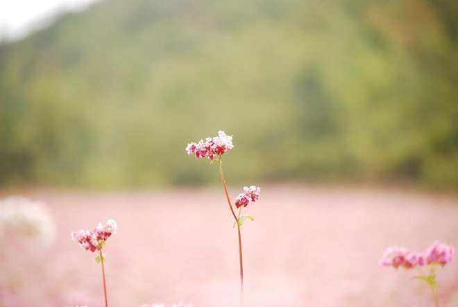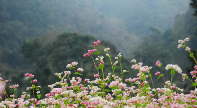 Màu trắng hồng của những cánh hoa tam giác mạch ngút ngàn phủ khắp các thửa ruộng bậc thang, xếp tầng tầng, lớp lớp viền quanh những mái đồi như chiếc váy nhiều tầng của người thiếu nữ. Những bông hoa nhỏ xíu ấy kết thành từng thảm hoa bồng bềnh phủ hồng tim tím các sườn núi để che đi cái gai góc của một vùng “đá nhiều hơn đất”.