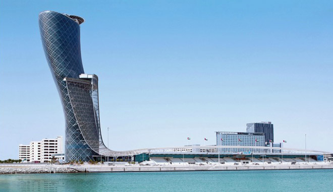 12. Hyatt Capital Gate: Tòa nhà cao 160m, nghiêng một góc 18 độ (gấp 4 lần tháp nghiêng Pisa, Italia) được sách Kỷ lục Guinness công nhận là "Tòa tháp nhân tạo nghiêng nhiều nhất thế giới".