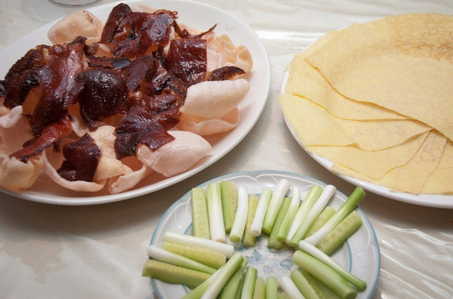 Sự kết hợp giữa thịt mềm, lớp vỏ giòn của vịt quay Bắc Kinh khiến thực khách nào cũng mê mẩn. Nếu bạn muốn thưởng thức đúng cách, hãy ăn thịt vịt gói trong bánh pancake, hành, dưa chuột và chấm tương đen.