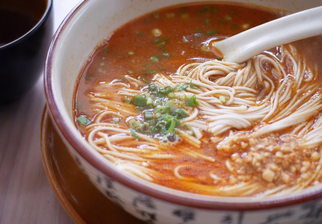 Một món ngon quen thuộc trên các con phố ở Tứ Xuyên là mì dan dan mein. Tô mì nóng, nổi bật màu dầu ớt, chút thịt bằm và rau xanh bên trên.