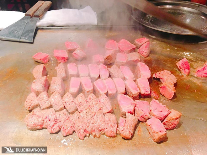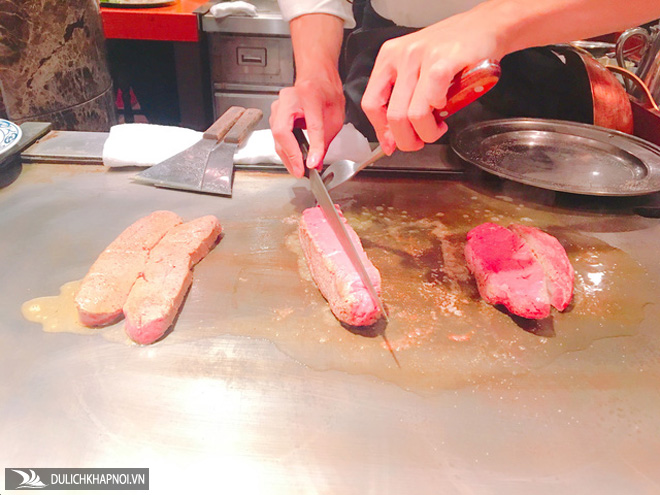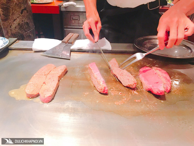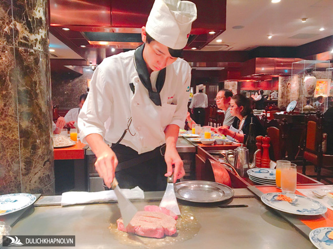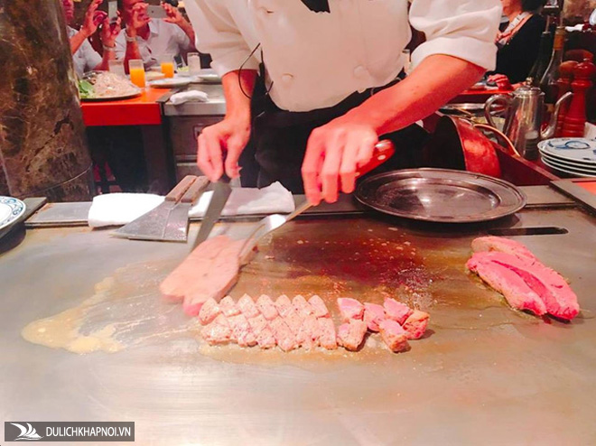 Nhìn đôi tay thoăn thoắt của những anh chàng đầu bếp biểu diễn chế biến trên bàn ăn, với miếng thịt bò đỏ hồng, hương thơm bốc khói trước mặt khiến ai cũng "thèm thuồng".