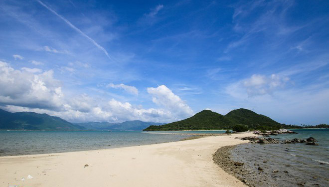 Điệp Sơn là một cụm gồm 3 hòn đảo nhỏ thuộc vịnh Vân Phong (Khánh Hòa). Hòn đảo này trở thành cơn sốt trên các diễn đàn thời gian gần đây nhờ con đường nổi lên giữa biển khi thủy triều xuống. Ảnh: Hải An.