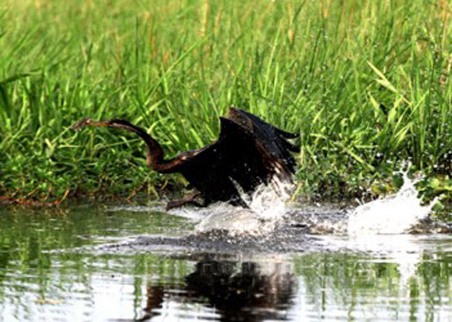 Mùa nước nổi Tràm Chim có nhiều cá nên chim, cò từ khắp nơi tập trung về kiếm thức ăn. Hình ảnh chim còng cọc săn được con cá chốt.